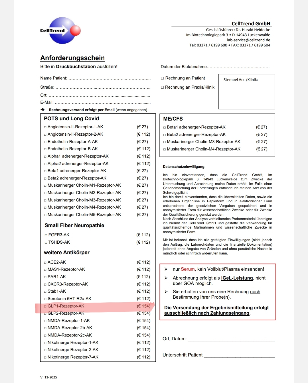 CellTrend was the first to describe autoantibodies against GLP-1R and has filed a patent application. This patent covers a test system for the diagnosis, prognosis, and treatment monitoring of myalgic encephalomyelitis or chronic fatigue syndrome (ME/CFS) in patients. The anti-GLP-1R antibody can only be determined by CellTrend using serum analysis.
