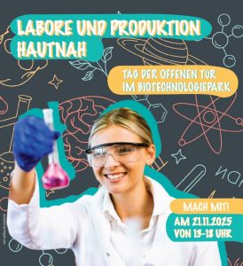 Save the date! Am 21.11.2025 öffnen ansässige Firmen im Biopark in Luckenwalde wieder ihre Labore. Nutzen Sie die Gelegenheit und erfahren Sie spannende Informationen rund um die Berufsfelder Mikrobiologie, Biochemie sowie Elektrotechnik. Unternehmer und Unternehmerinnen berichten in Vorträgen aus dem Berufsalltag und geben Einblicke in die neusten Produkte. Auch Bildungsinstitutionen sind vertreten und informieren zum Thema Ausbildungs- und Studienmöglichkeiten. Melden Sie sich noch heute hier an!